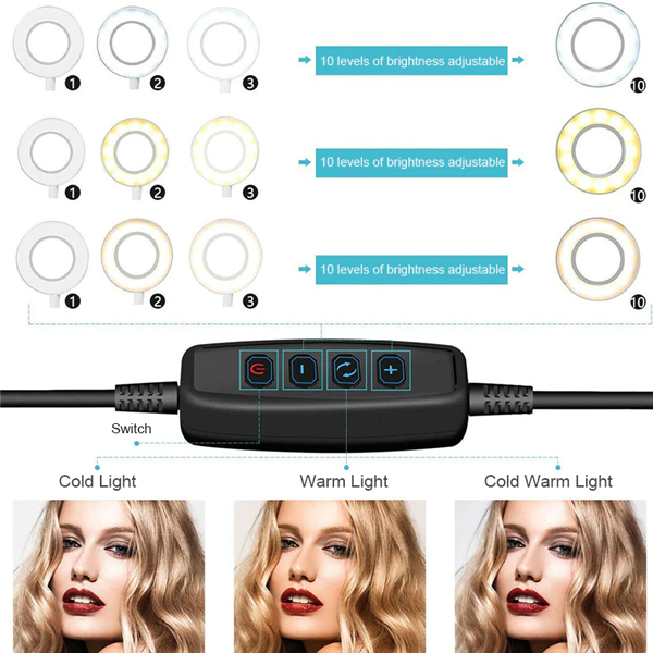 3.?Dimmable Ring Light?3 colors lighting mode: cool white, warm white, and day light. Each lighting mode has 10 adjustable brightness to choose from, meet all your needs in different circumstances. It is the perfect dimmable daytime lighting to take away all the unflattering shadows!